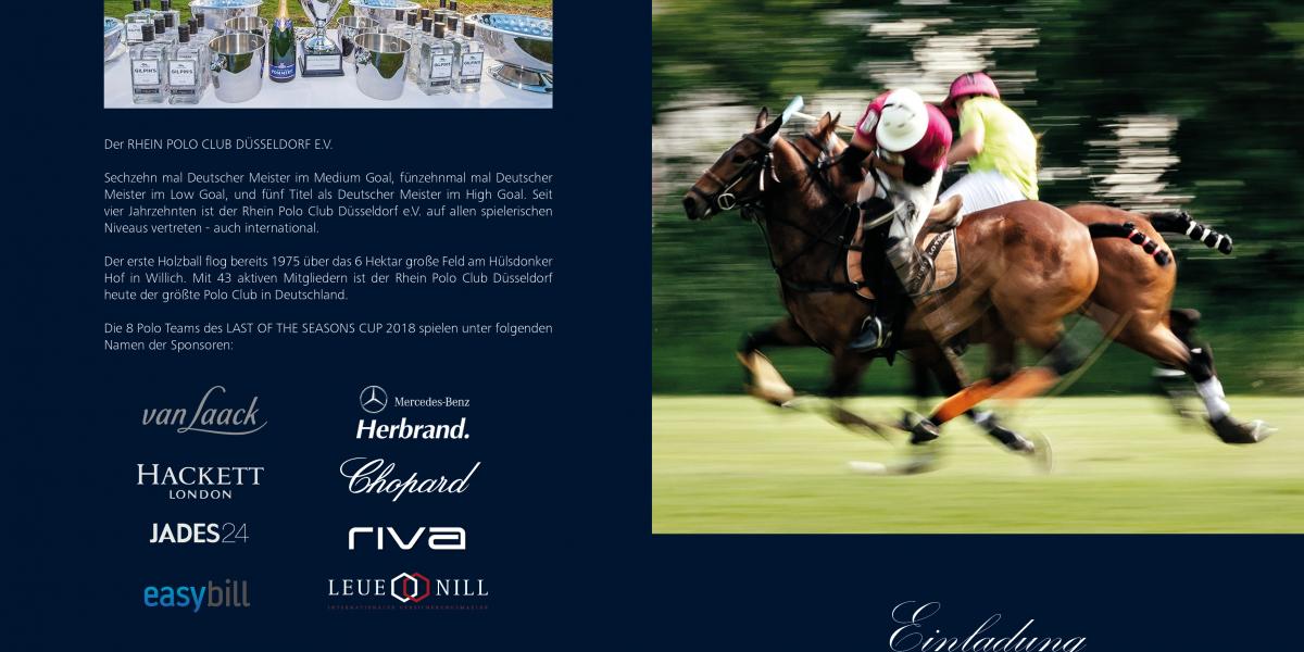 Herr Theodor J. Tantzen, Präsident des Rhein Polo Club Düsseldorf e.V. und Graf und Gräfin Franz Josef Beissel von Gymnich, Schirmherr und -herrin des Cubs laden die Mitglieder unseres Clubs herzlich ein zu einer fröhlichen und zwanglosen „Country Come Together Party am Spielfeldrand" anlässlich des "Last ofthe Season Cub 2018".